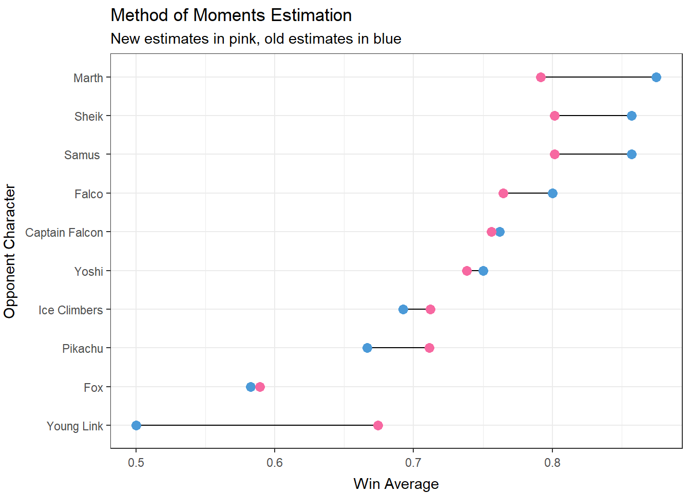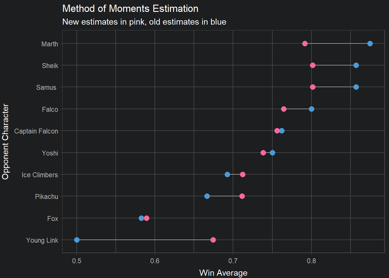 The data above have been arranged in descending order by the absolute difference between their new win average estimates and their old win average estimates. Young Link shows the largest change in win percentage between the two estimates, which is interesting considering that we were hoping to improve our estimate of this specific matchup. Alteratively, Hungrybox’s win percentage in the Fox matchup shows one of the smallest differences between the two estimates. This makes sense considering that we have a large amount of data for that specific matchup.