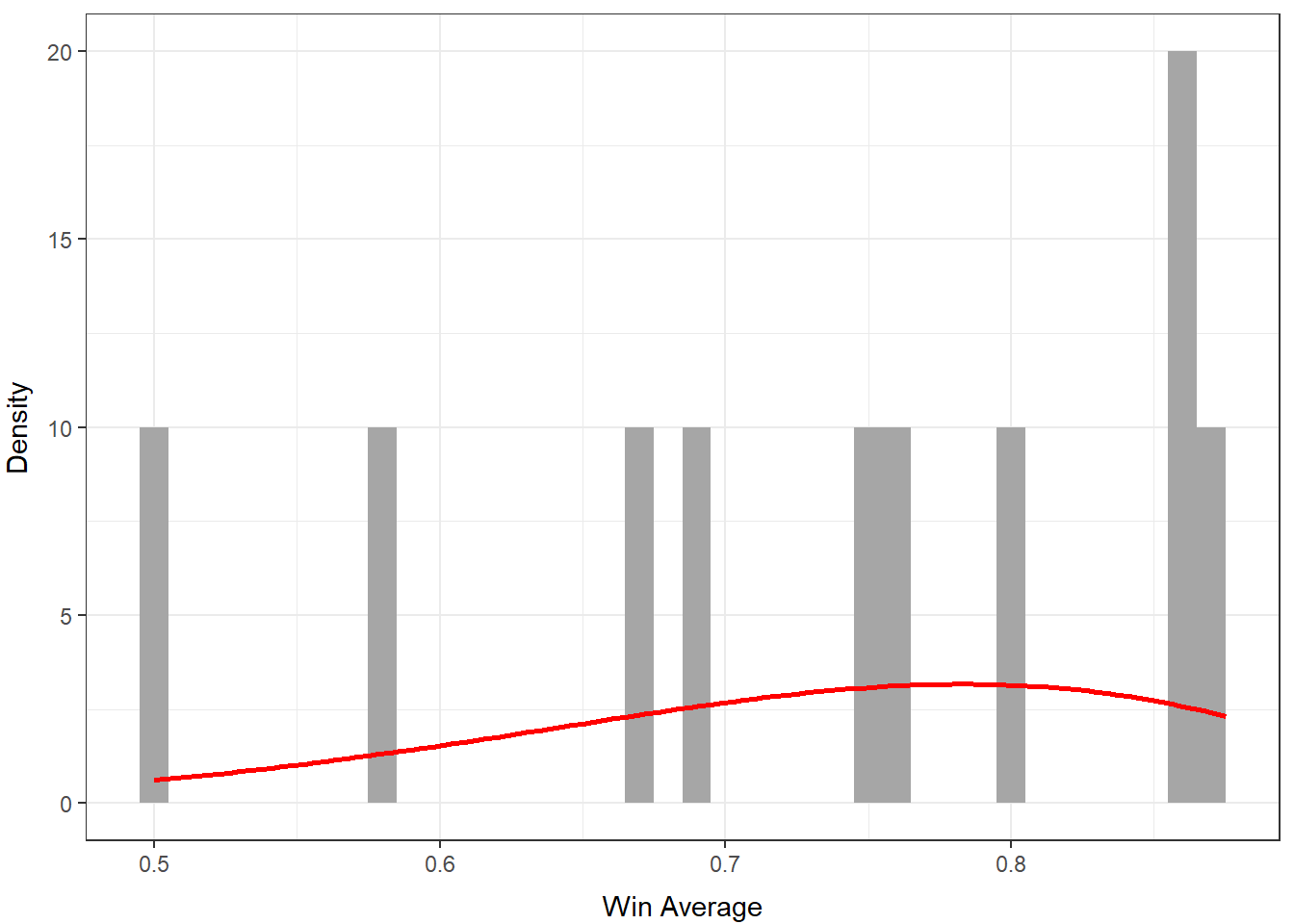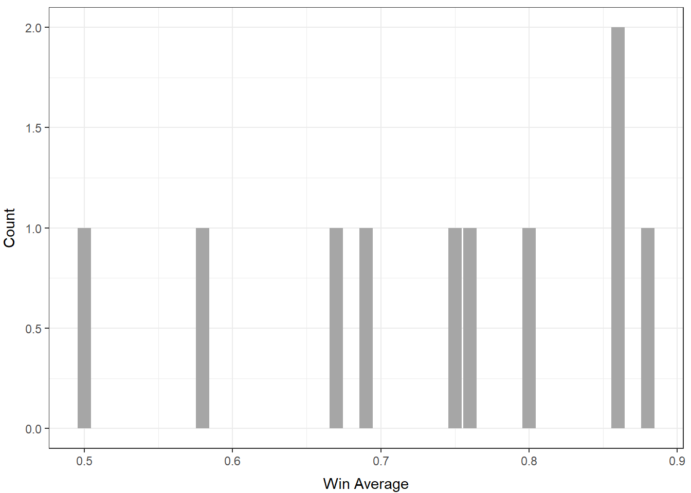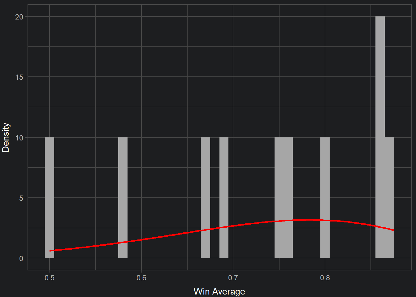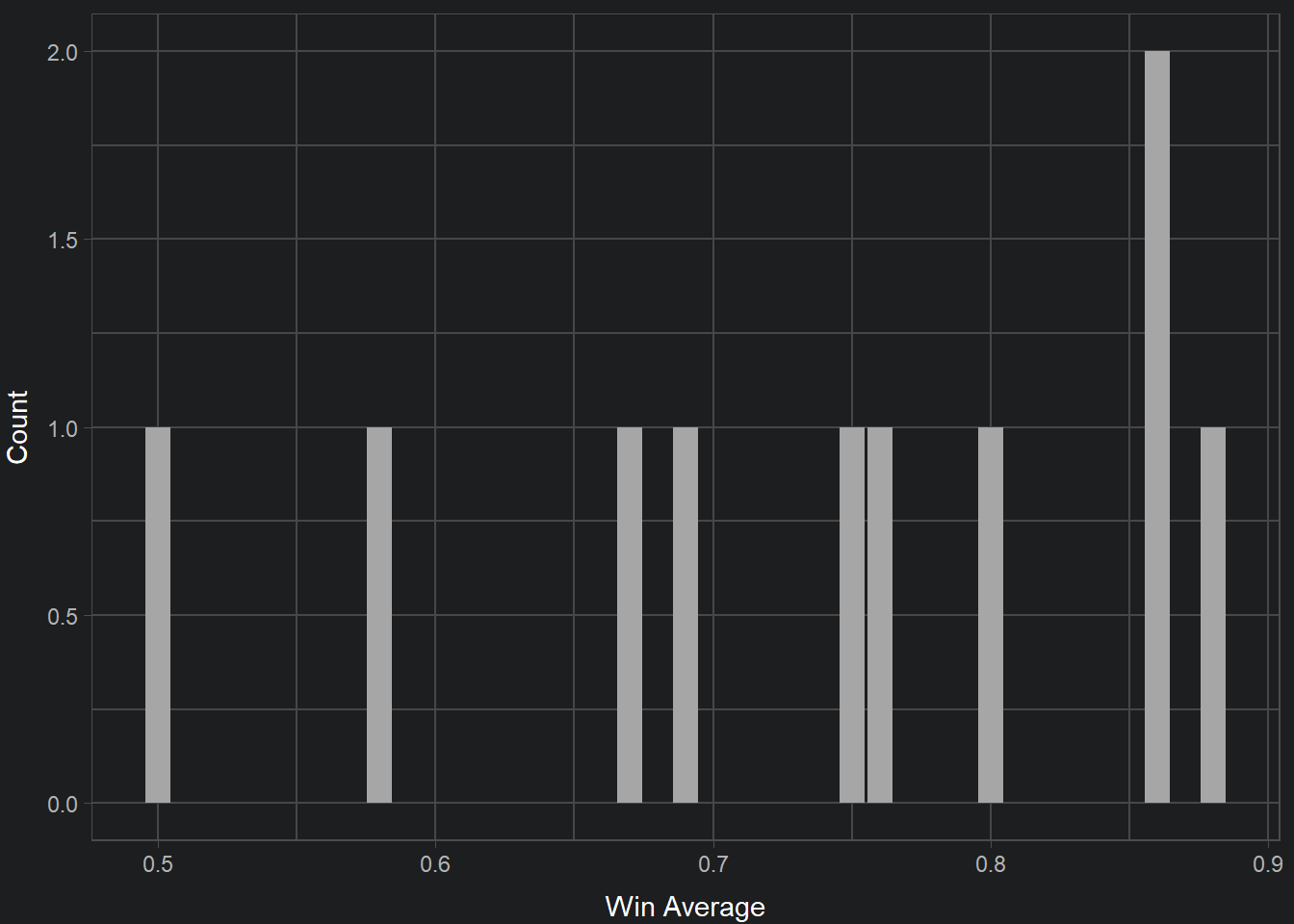 Alternatively, here is a the distribution of win averages across all matchups. This distribution leaves a lot to be desired because it has a small number of observations. This is due to the fact that there are not many characters (out of the 26 possible characters) that are played in high level Melee. Unfortunately, the small amount of data will not yield the strongest approximations of win percentages, but we will continue with what we have.