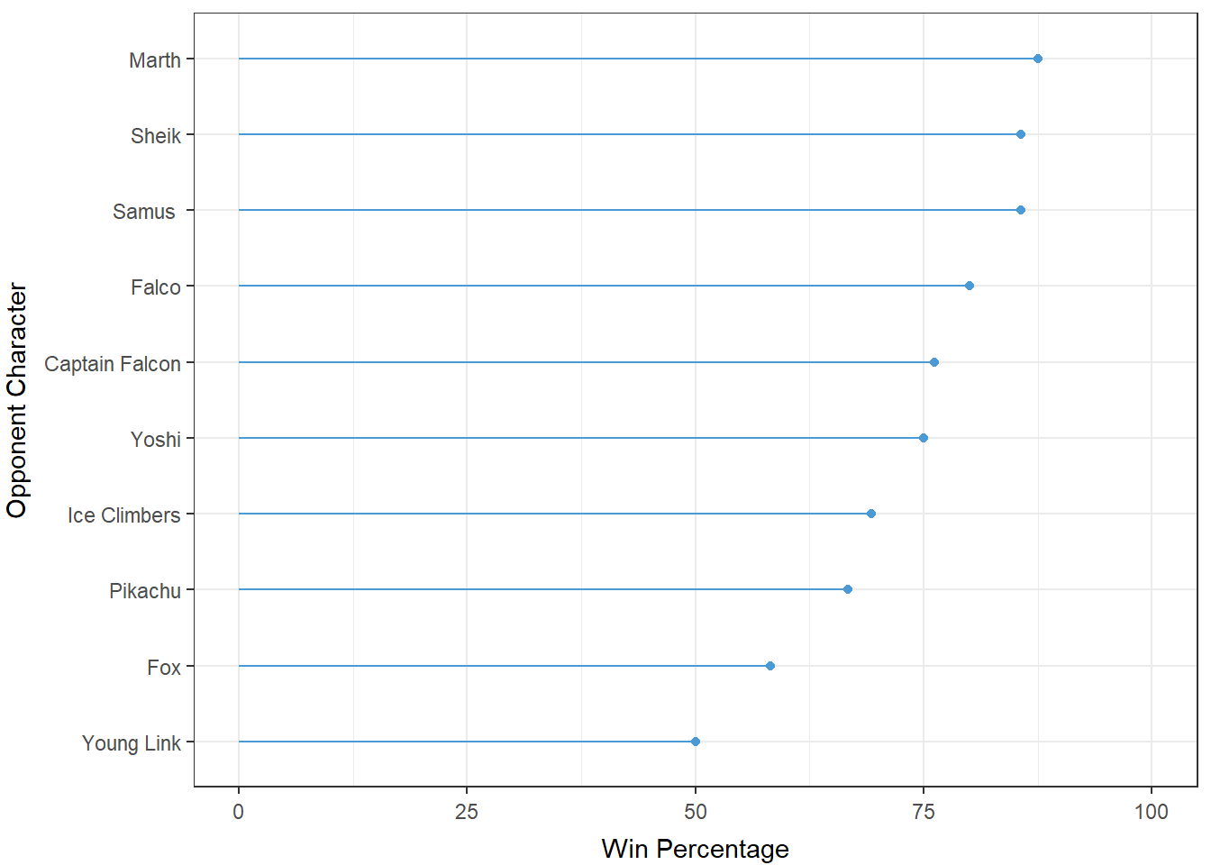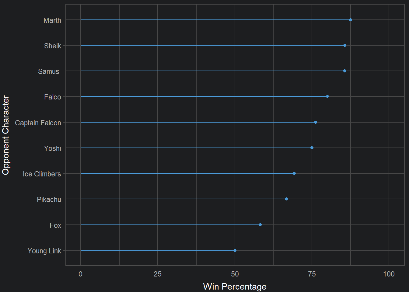 With these limitations in mind, this analysis suggests that Young Link is not an optimal character choice versus Hungrybox. In unsurprising fashion, Fox remains Hungrybox’s most difficult matchup, a sentiment believed by Hungrybox, himself. It is an almost natural assumption that the best character in the game would be the hardest to play against, even if you’re #1. Despite the somewhat underwhelming conclusion, the important lesson is that extreme or simplistic solutions should not be applied to complex problems. This statement holds especially true when there is little evidence behind the proposed solution. In order for Young Link to be considered as a legitimate character choice versus Hungrybox, we would require a substantial amount of evidence.