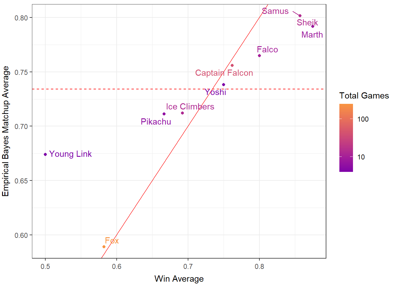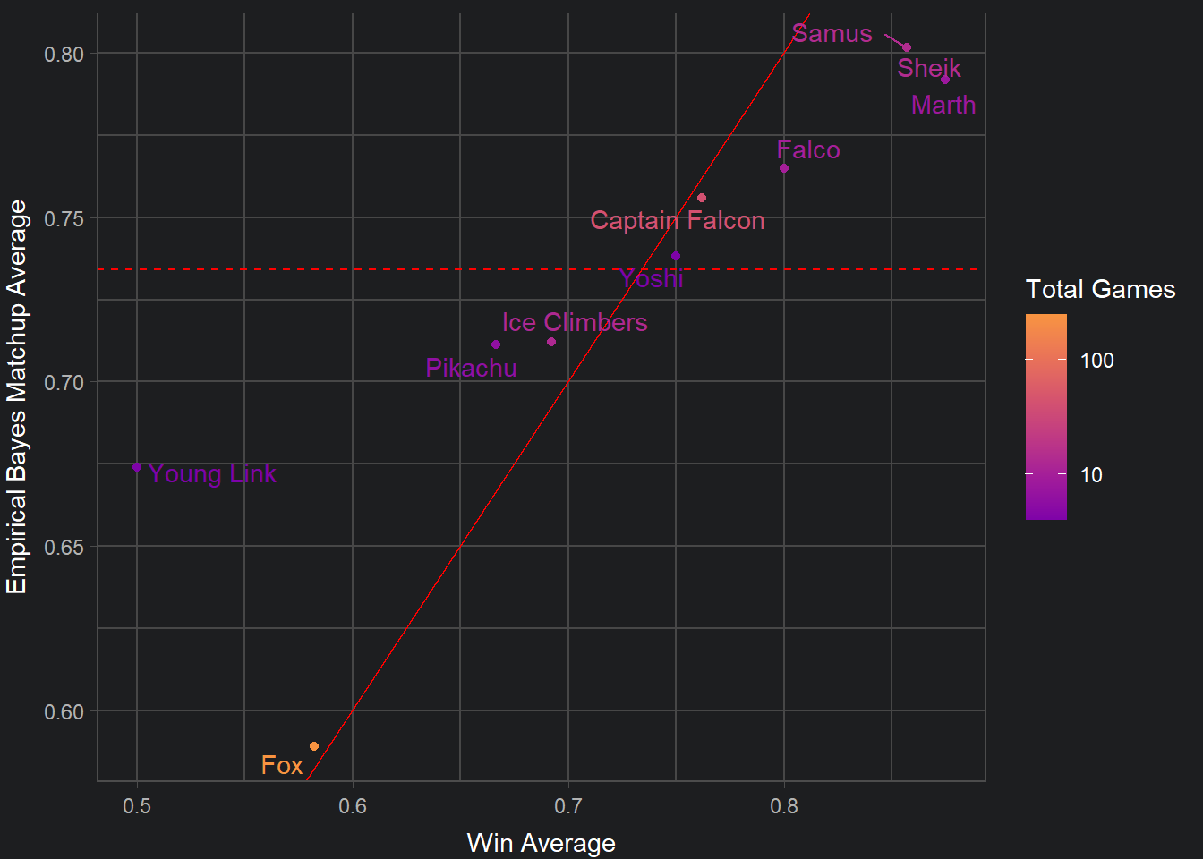 The solid red line indicates where Hungrybox’s win averages are equal to the Bayesian estimates. What this allows us to infer, is the change in estimates. The further away a point lies from the line, the greater change between the original average and the new average. For example, Young Link, Sheik, Marth and Samus show more change in their estimates compared to the other characters.